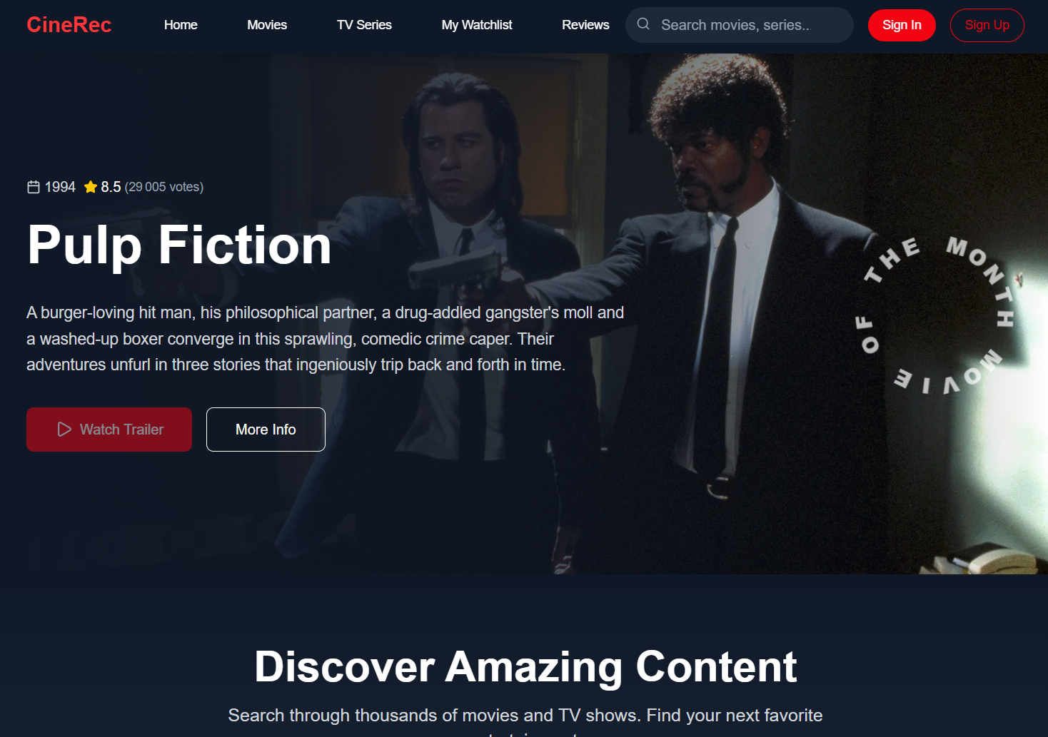 A full-stack movie and TV series rating and recommendation app built with Next.js, Express, MongoDB, and TypeScript. Features real movie data from TMDB API, user authentication, watchlists, and YouTube trailer embeds.